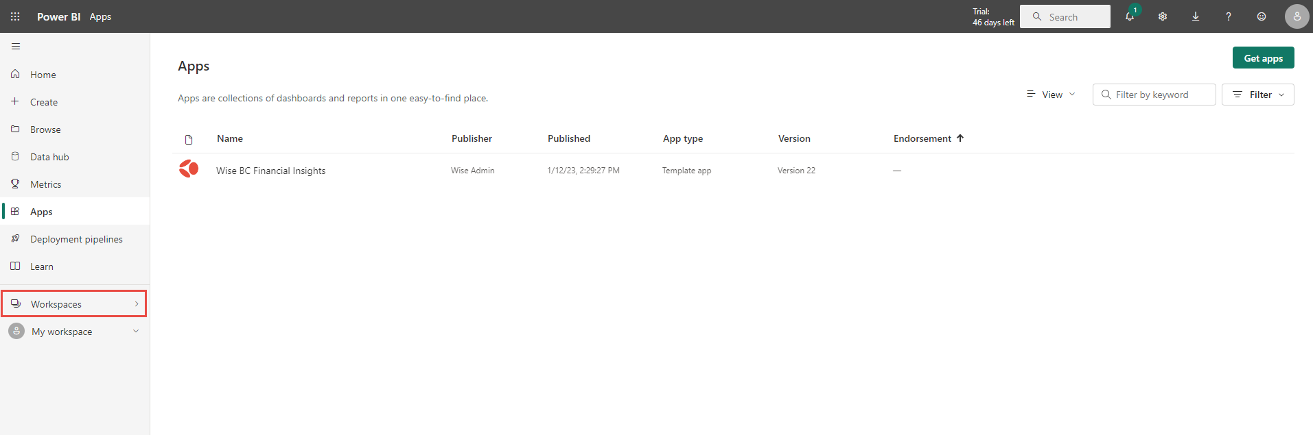 Select Workspaces menu and open the app workspace you require