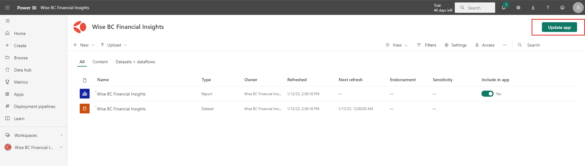 Select Workspaces in the left menu and open the same name app workspace